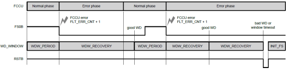 当FCCU引脚指示错误并且FS0B有效时,会发生从WDW_PERIOD到WDW_RECOVERY的转换。如果MCU在WDW_RECOVERY持续时间结束之前发送了正常看门狗刷新,如果FCCU引脚不再指示错误,则器件将切换回WDW_PERIOD持续时间和相关的占空比。否则,将启动新的WDW_RECOVERY周期。如果MCU在WDW_RECOVERY持续时间结束之前未发送正常的看门狗刷新,则会生成复位脉冲,故障安全状态机将返回INIT_FS。