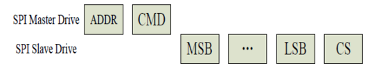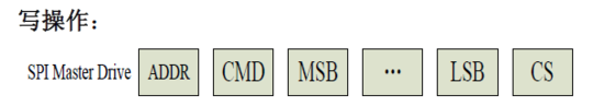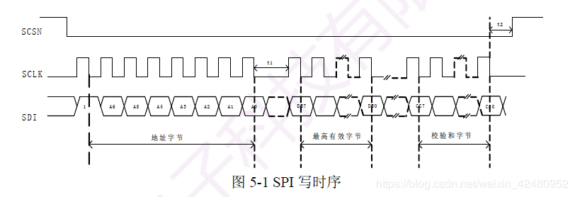 SCSN拉低,开启通讯。主机依次写入地址,命令,数据(高位在前,低位在后),CS校验。主机在SCLK下降沿将数据通过SDI写入从机。最后SCSN拉高结束通讯。