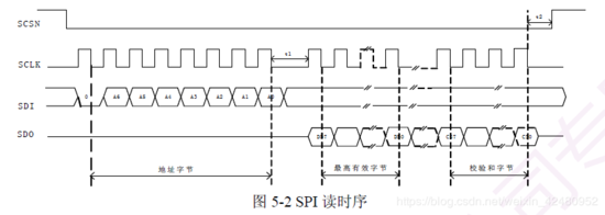 SCSN拉低开启通讯,主机先写入地址+命令共两个字节,随后在SCLK下降沿读取从机从SDO输出的数据(高位在前,低位在后)。最后SCSN拉高结束通讯。
