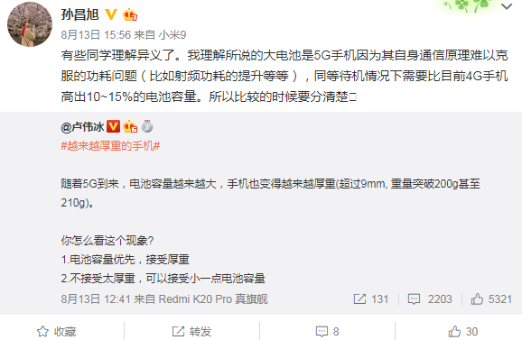 5G手机耗电这不是vivo子品牌iQOO一家的观点,小米产业投资部合伙人孙昌旭认为大电池是5G手机因为其自身通信原理难以克服的功耗问题(比如射频功耗的提升等等),同等待机情况下需要比目前4G手机高出10~15%的电池容量。