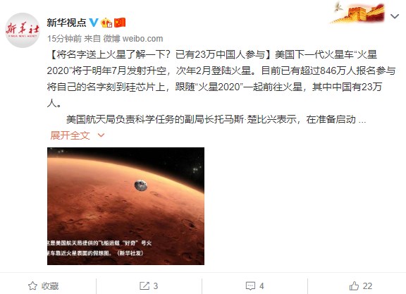 2019年08月19日 | 将名字刻硅芯片送往火星:已经有23万中国人参与
