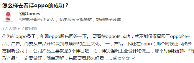 在知乎上有网友提了一个叫做“怎么样去看待OPPO的成功?”的问题,得到了不少人的关注,其中前OPPO员工、现OPPO股东、现飞傲电子联合创始人@飞傲James的回答得到了不少人的认同。