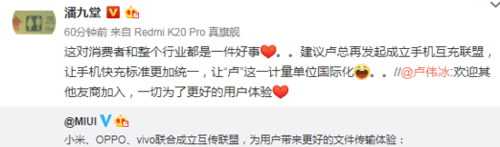 “这对消费者和整个行业都是一件好事。建议卢总再发起成立手机互充联盟,让手机快充标准更加统一,让“卢”这一计量单位国际化。”