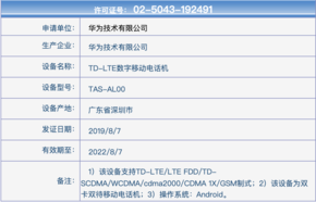 这两款新机的型号分别为TAS-AL00以及LIO-AL00,入网时间均为2019年8月7日、均支持TD-LTE/LTE FDD/TD-SCDMA/WCDMA/cdma2000/CDMA 1X/GSM制式,以及双卡双待。不过遗憾的是,工信部并没有放出这两款新机的真机素颜照,这保密工作还真是到位。