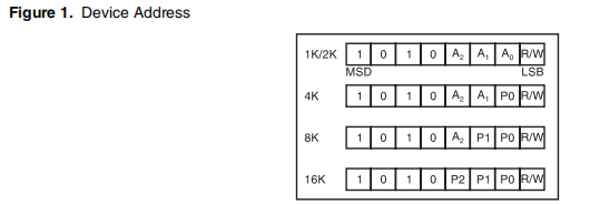 通过查阅AT24C02的数据手册,该产品属于2k容量,2k指的是bit,所以等于256字节,需要一个8位数据字进行寻址。另外设备地址可以在数据手册里查到。