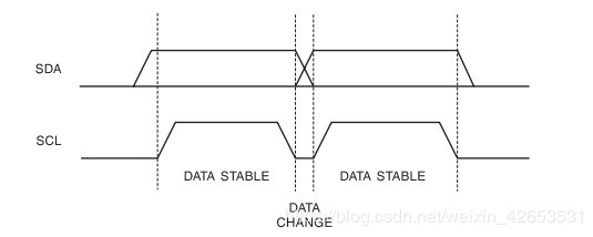 iic使用SDA信号线来传输数据,使用SCL时钟线进行数据同步。SDA数据线在SCL时钟线的每一个周期内传输一位,当SCL时钟线为高电平时,SDA数据线有效;即当SCL为高电平,若SDA为高电平表示数据“1”,若SDA为低电平表示数据“0”。当SCL时钟线为低电平时,SDA数据无线,一般这个时候SDA进行电平切换,为下一次表示数据进行准备。