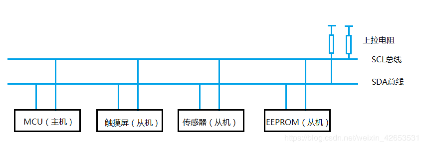 一个C总线只使用两条总线线路;一条双向串行数据线(SDA),一条串行时钟线(SCL)。