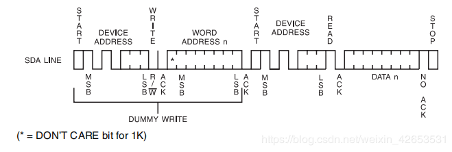 对照着图来说,首先是发送从机地址"DEVICE ADDRESS",接着给从机发送"WORD ADDRESS"是所读取内容的地址,这是告诉AT24C02接下主机需要的内容,设置好地址之后,接着主机再发送一个起始位,紧接着发送"DEVICE ADDRESS",这时可以注意到传输方向是READ(读),那么主机释放SDA线的控制权,有从机给主机发送数据,可以连续发送多个字节数据,当主机期望停止接收时作出一个非应答,那么从机就停止发送了。