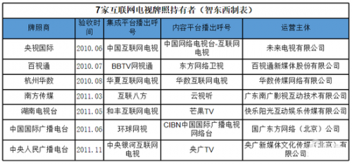 2010年3月,国家广电总局给CNTV颁发了首张互联电视牌照,牌照持有方负责建设互联网电视集成平台。此后,上海百视通、浙江华数、南方传媒、中国国际广播电台、中央人民广播电台、湖南电视台共6家单位先后获颁互联网电视集成牌照,这7家平台也成为了后来互联网电视内容的集成提供方。
