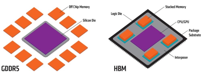 HBM(High bandwidth memory)是一款新型的CPU/GPU内存芯片(即“RAM”),就像摩天大厦中的楼层一样可以垂直堆叠。基于这种设计,信息交换的时间将会缩短。这些堆叠的芯片通过称为“中介层 (Interposer)”的超快速互联方式连接至 CPU 或 GPU。将HBM的堆栈插入到中介层中,放置于 CPU 或 GPU 旁边,然后将组装后的模块连接至电路板。