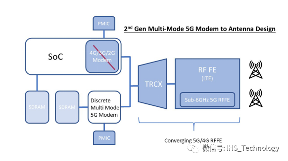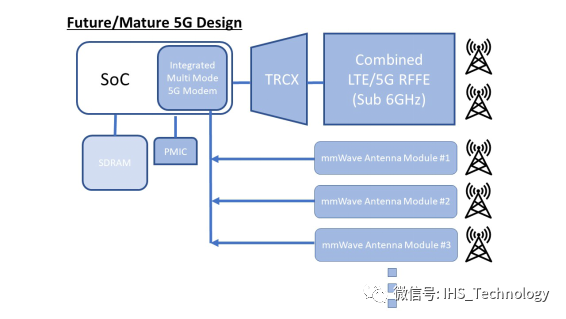我们将在未来看到怎样的5G设计?按照近十年前4G LTE调制解调器的演进路线,我们将在2020年的5G智能手机设计的下一次迭代中看到多模5G调制解调器与智能手机SoC本身的集成(图5)。这种更高的集成度将影响现有支持SoC的SDRAM和电源管理,并消除主板上的额外芯片,更重要的是,影响物料清单(BOM)成本。