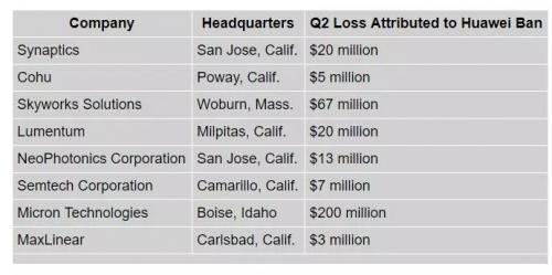 至少,这是美国上市公司在与分析师进行第二季度财报电话会议时,直接归因于禁令的金额。这项禁令的真正经济影响无疑要大得多。毕竟,高通、Lattice Semiconductor、Microchip Technology、Inphi Corporation和 Qorvo等众多美国上市公司都表示,禁令直接影响了它们的季度业绩,但高管们没有具体说明具体金额。此外,美国私营企业也受到禁令的约束,但它们不会公开报告业绩。