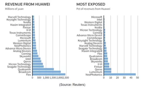 路透社援引华尔街分析师的话说,为了把这些数字放在实际情况中考虑,华为去年在零部件上的支出约为700亿美元,其中约110亿美元流向高通、英特尔和美光科技(Micron Technology)等美国公司。路透社还发布了一份图表——基于高盛援引企业数据和彭博的信息——显示了企业从对华为的销售中获得的收入,以及华为在其业务中所占的比例。