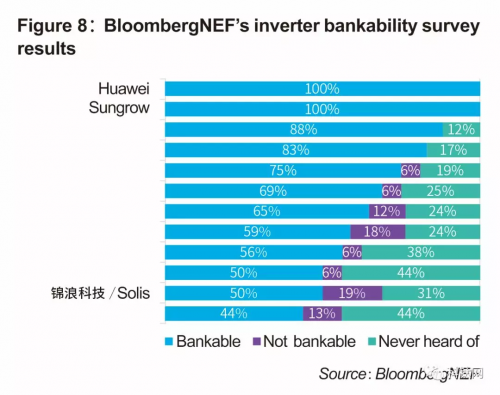 近期,彭博新能源财经BNEF发布《2019年组件与逆变器融资价值报告》(Solar Module & Inverter Bankability 2019),主要针对全球知名光伏产业制造商的融资价值展开调研。凭借稳健的财务表现、可靠的产品质量、良好的企业商誉,华为、阳光、锦浪、东芝三菱位列逆变器可融资性排名亚洲四强品牌。