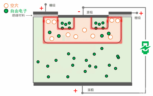 源极与漏极电压不变,栅源加正电压,神奇的现象再次发生了。栅极将P部分电子吸引到绝缘板附近,空穴被填充,此处电位逐渐变化到和两旁N部分相同,于是一条通道打开了。