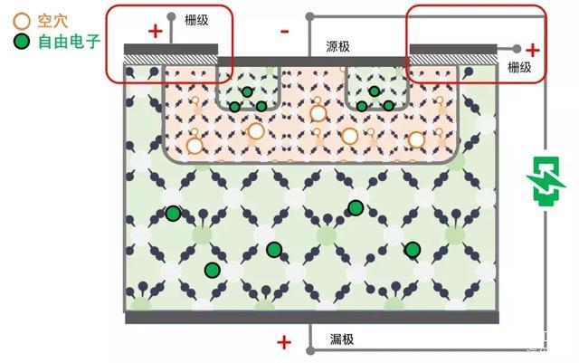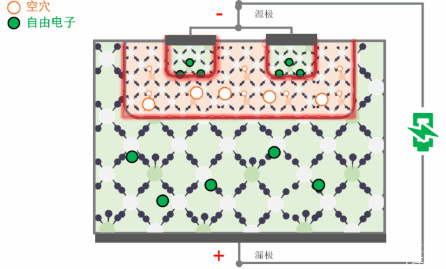 之后电子在源极、漏极电压驱动下运动,产生电流,电路接通。