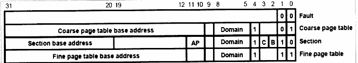 高12位为PA(物理地址)的高12位,AP设置访问权限(常设置为11,特权模式/用户模式下可读可写,所有模式下允许任何访问),domain(域设置,arm9有16个域,此处设置0选择域0),C(是否开启cache),B(是否开启Write buffer),其他位用默认值。