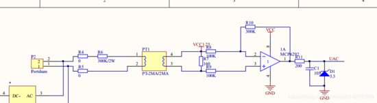 注意转换时间要短.Uac的值除以放大倍数(4),就是接在160Ω电阻的电压,再除以160就是流过电流互感器两边的电流,乘以300K就是接入的交流电压有效值.