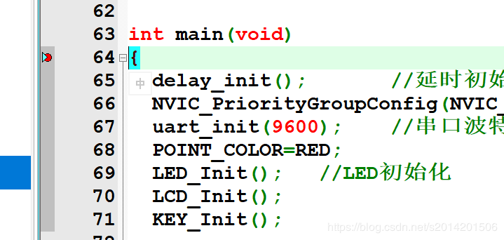 首先在进入主函数后设置断点。点击全速运行后程序到断点处,再次点击全速运行程序,设备处于死机状态。