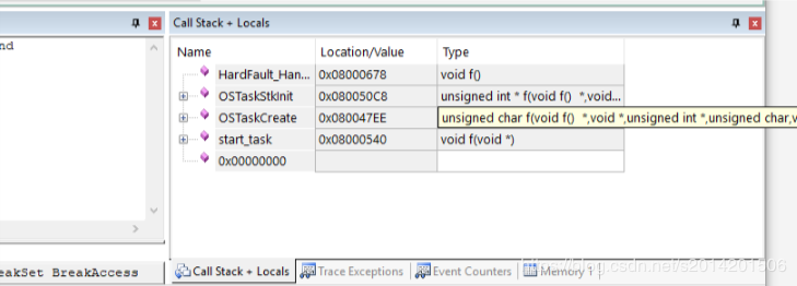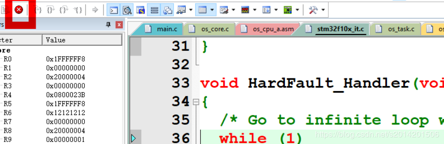 点停止按钮光标会自动定位到f10x_it.c下面的HardFault_Handler函数,同时在Call Stack+Locals 窗口下面出现了几个函数
