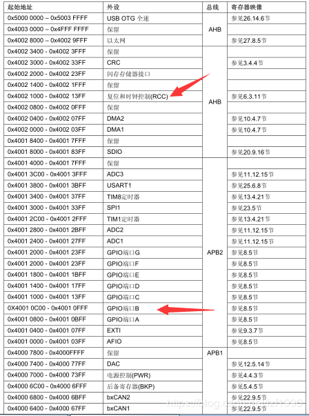我现在要使用GPIOB0,首先使能GPIOB的时钟,时钟也是寄存器控制的啊,查上面的地址表,RCC的基址是