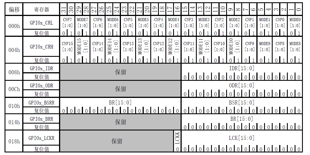 看看其中的CRL寄存器,偏移是0x00 。如果要找GPIOB的CRL寄存器,则起始地址0X4001 0C00+偏移0x00