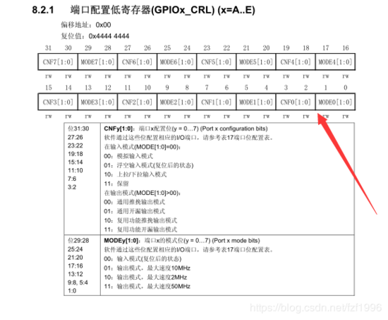 再设置GPIOB的IO模式,CRL寄存器控制。(CRL控制低8位引脚IO的模式,CRH控制高八位IO的模式,四位控制一个io的模式,一个寄存器控制8个引脚,共32位,一个寄存器)