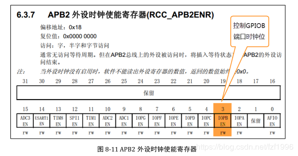 0x40021000,使能GPIOB的时钟,它是由RCC_APB2ENR控制的,因为挂在APB2总线上。偏移是0x18