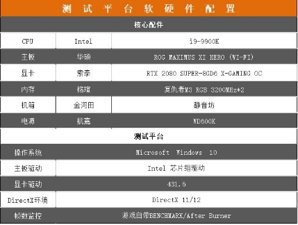 先来看看此次首测的测试平台,CPU方面我们采用第九代Intel八核心十六线程的i9-9900K、ROG MAXIMUS XI HERO (WI-FI) 主板、影驰的HOF OC LAB MASTER DDR4-4000内存,电源为航嘉WD600K。