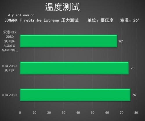在温度方面,经过FSE压力测试的软件检测,索泰RTX 2080 SUPER-8GD6 X-GAMING OC的最高温度为67°,低于公版RTX 2080 SUPER °,低于公版RTX 2080 °。而67°的成绩在RTX 2080 SUPER系列来说是一个非常优秀的温度。