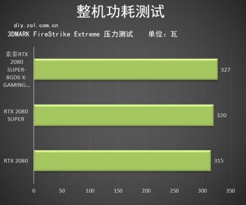 如图所示,索泰RTX 2080 SUPER-8GD6 X-GAMING OC的整机平台功耗为327W,较公版RTX 2080 SUPER的整机平台功耗高7W,相较公版RTX 2080整机平台功耗高12W。就目前来说,这个功耗在高端显卡是可以接受的。而索泰RTX 2080 SUPER-8GD6 X-GAMING OC的官方建议搭配650W电源。