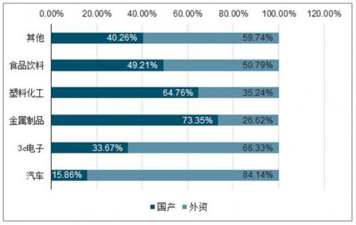 汽车整车生产是对工业机器人要求最高的行业,国外公司占据90%的市场,国内品牌只能在汽车零部件、3C、食品饮料等下游行业寻求突破。