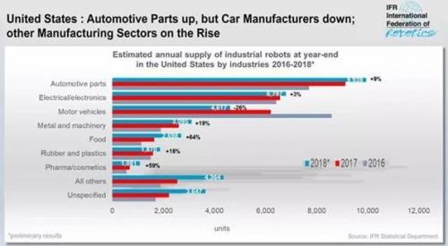 根据IFR最新统计显示2018年除去汽车,电子,零部件等热门制造业以外的其他类型制造业都出现了两位数的增长,包括食品和饮料,制药,塑料和金属行业。