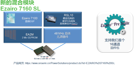 Ezairo 7160 SL是基于DSP的开放式可编程混合模块,是目前专业助听器芯片集成度最高的无线方案,在一个3.8*6.6mm的小封装中集成Ezairo 7100 DSP、行业最低功耗的蓝牙5无线电系统单芯片(SoC) RSL10、2 MB EEPROM(EA2M)和无源器件。