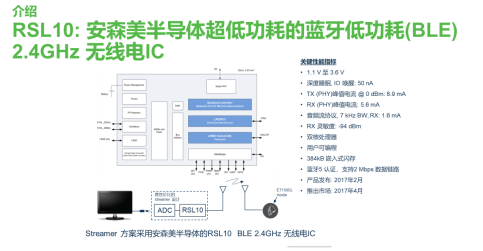 通过智能手机联接助听器已成为极具吸引力的特性。蓝牙低功耗(BLE)等短距离通信技术支持助听器利用移动设备(如智能手机和平板电脑)的屏幕作为接口及接收数据,采用BLE无线技术,音频也可直接从外部源如音响或配备辅助设备的电视串流到助听器。这可为佩戴者提供更身临其境的娱乐体验,具备更好的音频质量,从而为助听器佩戴者带来更佳的用户体验。RSL10是蓝牙5认证的无线电,支持2Mbps 数据链路,具有行业最低功耗,在EEMBC的能效评测中获行业最高评分,提供超低功耗互联,接收功耗仅7mW,在睡眠模式下功耗可忽略不计,仅62.5nW。且占位仅5.50mm2,易于纳入微型的助听器中。