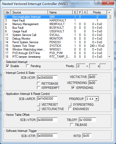 弹出如下窗口,在这个窗口里面就可以查看实际优先级了,比如滴答定时器Systick的优先级就是240,即240>>4 = 15。