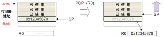 POP出栈操作:先从SP指针处读出上一次被压入的值,再把SP指针自增 4: