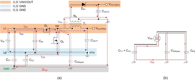 图 2:Fly-Buck 隔离式转换器 DM 和 CM 传导噪声传播路径 (a);CM 等效电路 (b)。