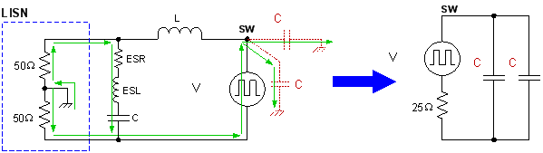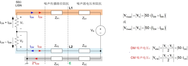 图 3:传导 EMI 发射模型,其中显示了噪声源电压、噪声传播路径和 LISN 等效电路。