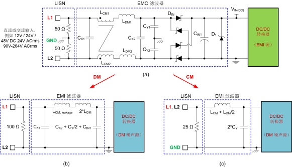 图 4:传统的 EMC 输入滤波器 (a),包括 DM 等效电路 (b) 和 CM 等效电路 (c)。