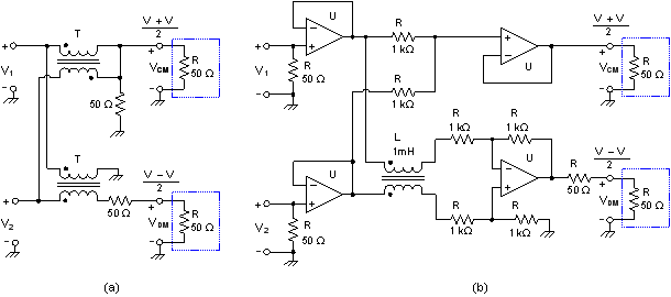 图 5:实现的用于分离 DM/CM 噪声的无源 (a) 和有源 (b) 电路。