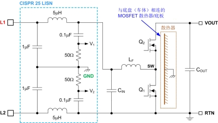 在车辆底盘接地端直接连接一个 MOSFET 散热器,可以提高转换器的热性能和可靠性,但共模 EMI 性能会受到影响。图 6 所示的原理图中,包含升压转换器以及 CISPR 25 建议采用的两个 LISN 电路(分别连接在 L1 和 L2 输入线上)。