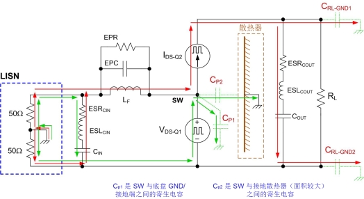 漏源开关(SW 节点)电压的上升沿和下降沿代表主要的 CM 噪声源。CP1 和 CP2 分别代表 SW 与底盘之间以及 SW 与散热器之间的有效寄生电容。图 8 显示了 SW 节点电容(电场)耦合为主要 CM 传播路径时简化的 CM 噪声等效电路。