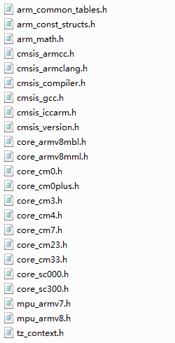 这两年情况好了不少,特别是ARM为ST做的CMSIS-Driver明显完善了很多。针对我们这个教程来说,当前还用不到这些东西,主要用到CMSIS软件包里面的如下头文件即可(不同版本,截图中的文件可能不同,这个软件包是一直在更新中的,下面的截图的版本是V5.3.0):