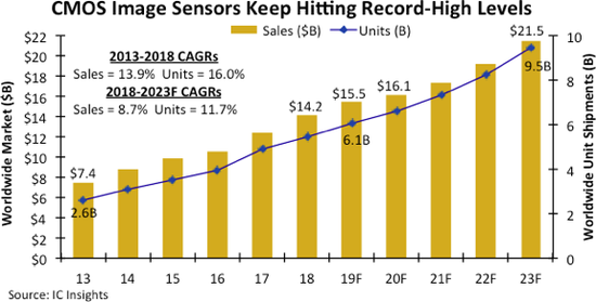 研调机构IC Insights指出,尽管预计今年和2020年经济成长将因中美贸易战影响放缓,但受惠数字影像产品应用逐渐普及,CMOS影像传感器市场销售额、单位销售量均预估至2023年均可年年创新高。