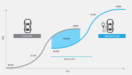 在该模型中,一项技术会先后经历萌芽期、成长期、成熟期和衰落期。当一项成熟技术的曲线和一项新技术的曲线重叠时,便会出现一段不连续期。这就会对市场造成冲击,因为当一款产品中采用了新的技术而且性价比极高时,客户会直接争相选择新技术。电动汽车技术目前正处在萌芽阶段。内燃机技术已经进入成熟阶段或趋于成熟,得到广泛采用,市场定位明确,技术实现了标准化/商品化,并且所有易于实现的优化均已完成。