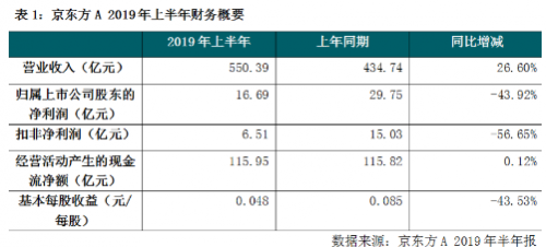 8月27日,京东方A披露了2019年半年报。报告显示,2019年上半年,京东方实现营业收入550.39亿元,同比增长26.60%;实现归属于上市公司股东净利润16.68亿元,同比下滑43.92%;实现扣非后净利润6.51亿元,同比下滑56.65%。