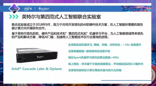 在AI数据处理能力上,结合英特尔®Cascade Lake CPU与第四范式软硬一体的优化,先知AI平台分布式模型训练框架训练速度获得飞跃。在TB级数据规模下,“第四范式先知”平台的模型训练速度可达Spark*的数千倍。英特尔®Optane固态盘则是“第四范式先知”平台引入的另一项英特尔 “杀手锏”,其3D XPoint™ 技术,正在打破内存和固态盘之间的边界。