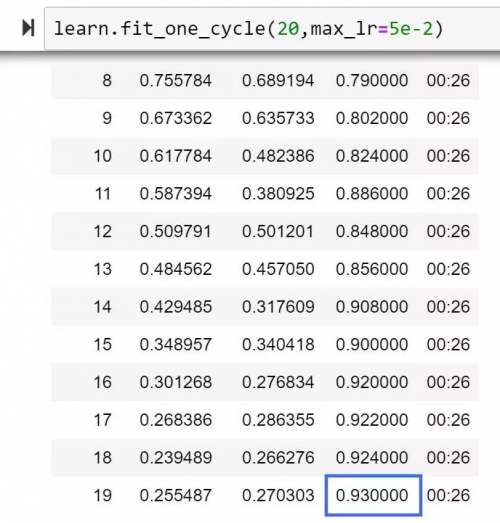 FastAI 的 20 个 epoch 准确率排行榜第一名,92%
