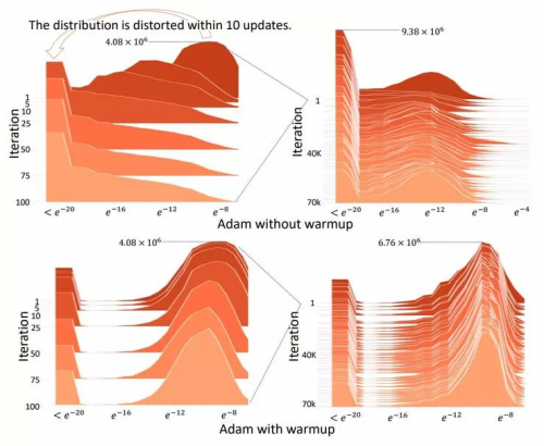 他们找到的原因是,在训练刚开始时有非常大的变动,可以说是优化器还没见到足够多的数据,没法做出准确的自适应动量选择。预热过程就可以在训练的初始阶段减小变差。根据上面这张图可以看到,没有预热阶段的时候,迭代早期的误差分布会发生剧烈变化。不过,多长的预热过程才算够需要手动调整,而且在不同的数据集上也会有所不同。